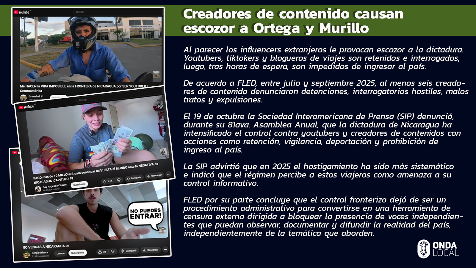 El temor del régimen Ortega Murillo a los youtubers viajeros que documentan sus vivencias en los países que visitan, es algo que también ha quedado en evidencia. Durante los últimos años varios creadores de contenido han sido impedidos de ingresar al país.