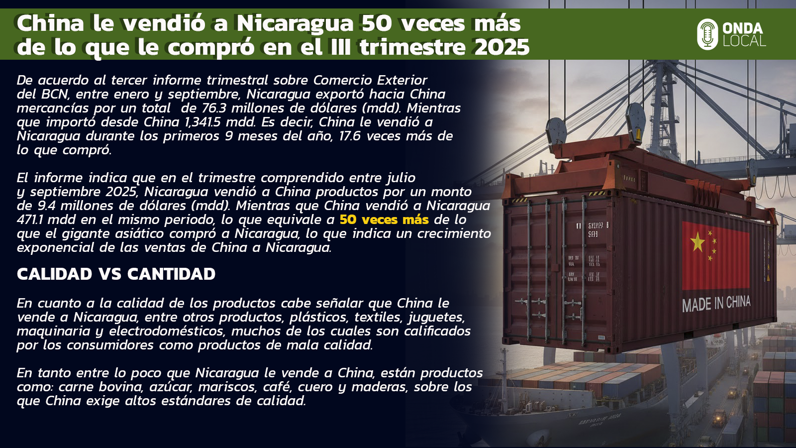 En consecuencia, refiere el experto, dado que las economías de Costa Rica y Guatemala son más dinámicas y más grandes en volumen de producción que Nicaragua, no se puede esperar otra cosa distinta, “China va a venderle a Nicaragua más de lo que compra, y por tanto el mercado nacional nicaragüense se va a inundar cada vez más de chinerías.”