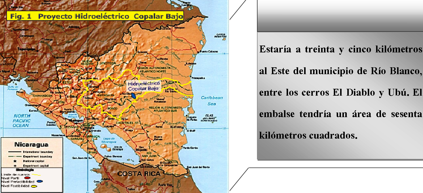 En la Página Web de dicha entidad estatal nicaragüense, se ha publicado un perfil con el nombre “Proyecto Hidroeléctrico Copalar Bajo”, que estaría a treinta y cinco kilómetros al Este del municipio de Río Blanco, entre los cerros El Diablo y Ubú. El embalse tendría un área de sesenta kilómetros cuadrados.