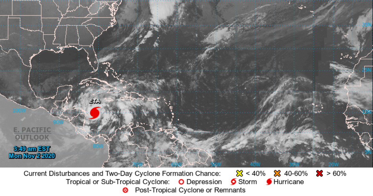 El huracán ETA se desplaza con vientos máximos sostenidos de 75 millas por hora (120 km/h) y se espera que siga fortaleciéndose mientras avanza hacia las costas caribeñas del noreste de Nicaragua y sureste de Honduras, donde impactará el lunes por la noche o martes por la mañana.