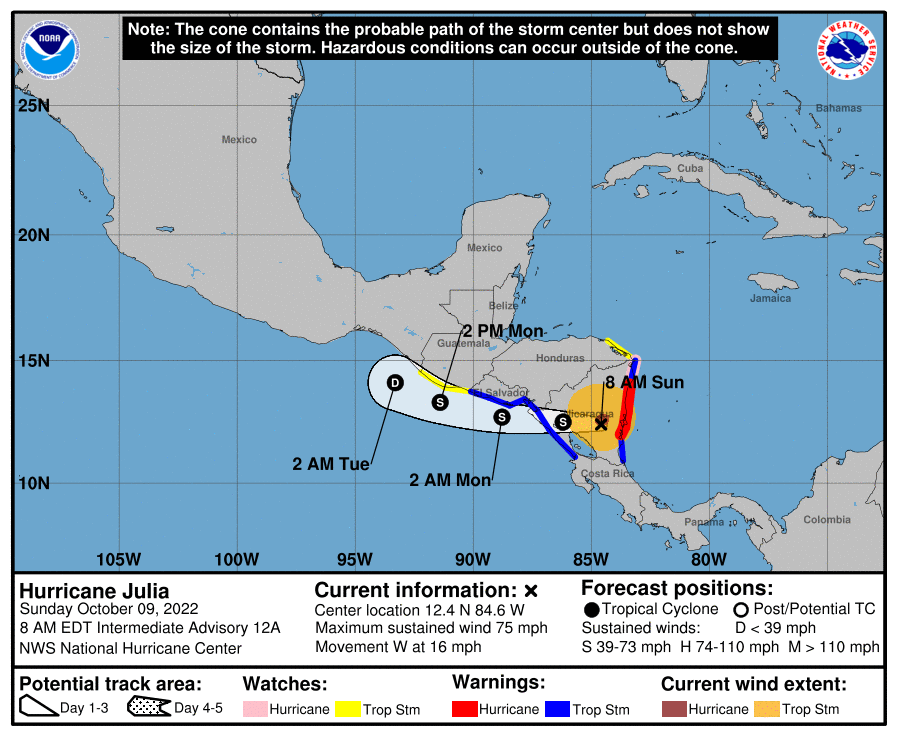 Según el Instituto Nicaragüense de Estudios Territoriales (ENETER) Julia entró en territorio nacional entre Orinoco y Laguna de Perla, a las 1:15 am de hoy domingo 09 de octubre, con vientos máximos sostenidos de 140 km/h, con velocidad de traslación de 26 km/h con rumbo Oeste.