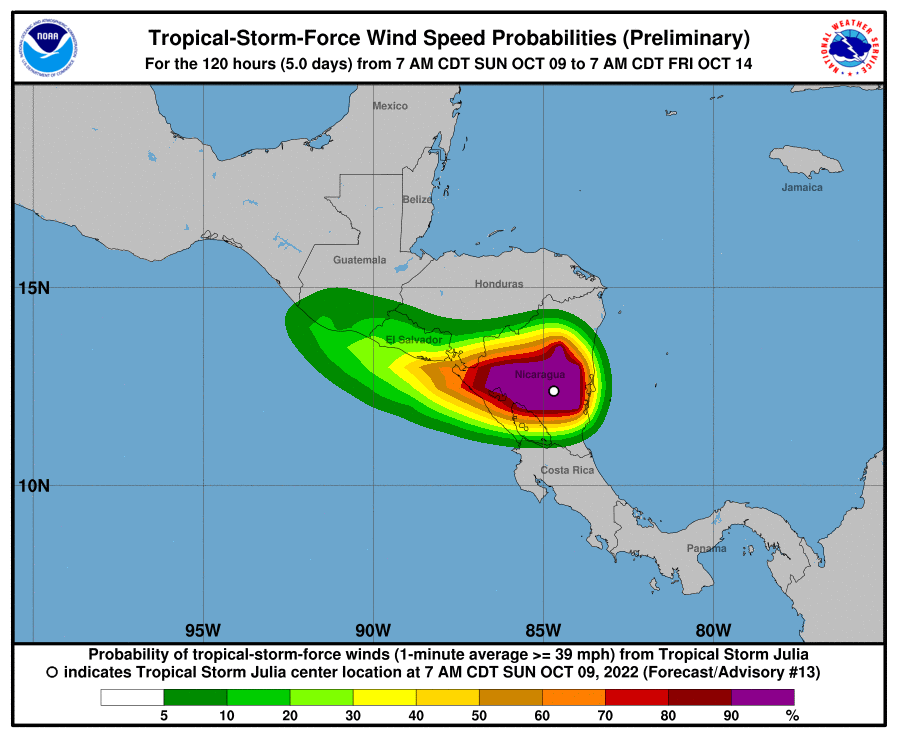 Al salir a aguas del Océano Pacífico, Julia podría fortalecerse nuevamente; incrementando sus vientos y el transporte de humedad desde el Océano Pacifico hacia el interior del país, generando más lluvias en la Región del Pacífico, principalmente.