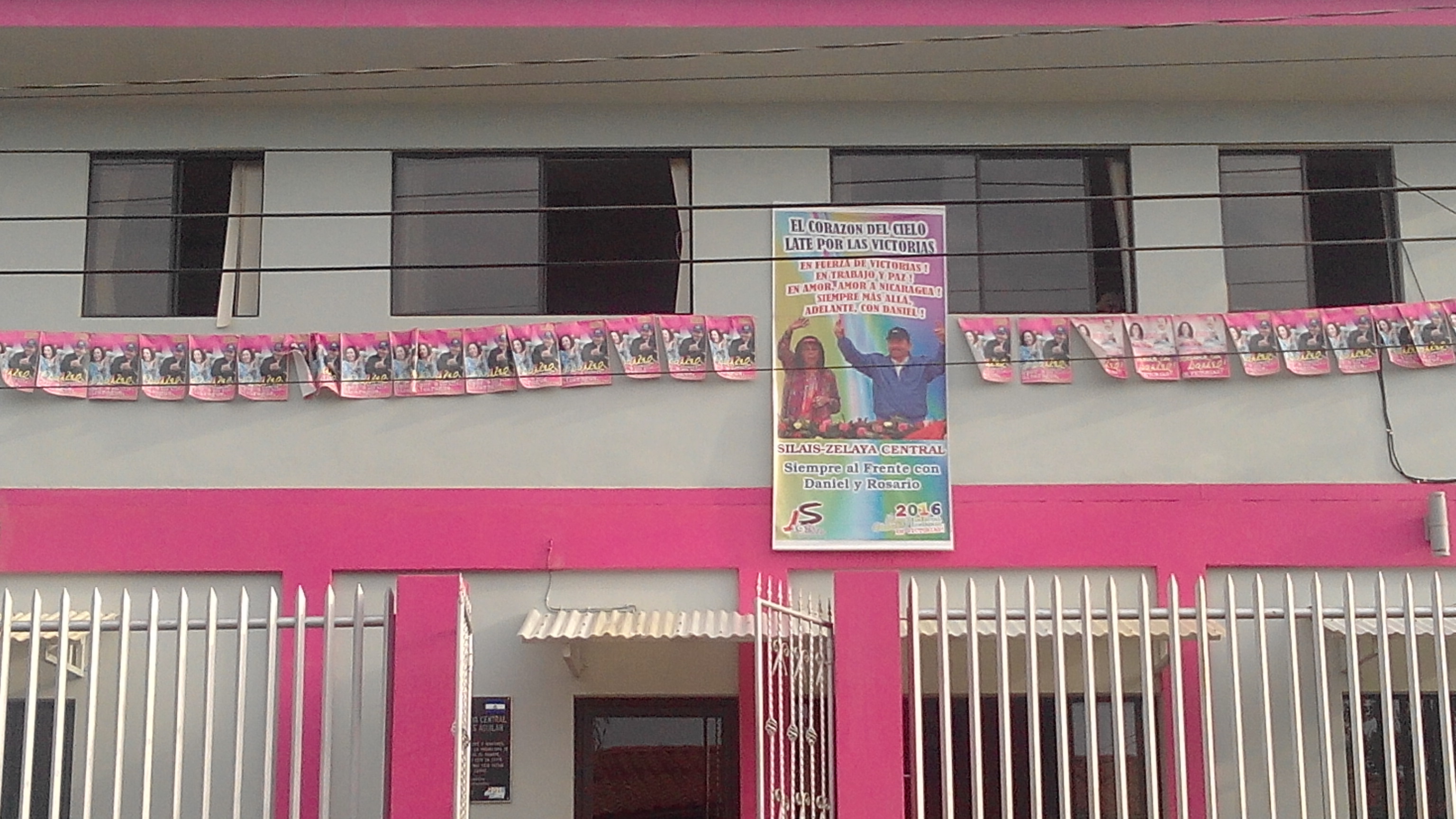 La Ley Electoral de Nicaragua prohíbe la colocación de propaganda en edificios públicos, pero el partido gobernante, Frente Sandinista de Liberación Nacional, FSLN, hace caso omiso. Banderas rojinegras y afiches de Daniel Ortega y Rosario Murillo, fórmula presidencial de dicho partido, cunden en edificios públicos.
