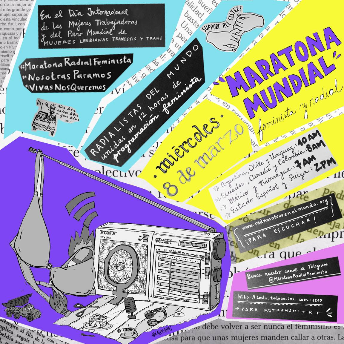 Comunicadoras feministas de Argentina, Chile, Colombia, Ecuador, Estado Español, Suiza, Canadá, Nicaragua, México y Uruguay, entre otros, realizan una #MaratonaRadialFeminista en el marco del Paro Internacional de Mujeres, Lesbianas, Travestis y Trans. En el Día Internacional de las Mujeres, radios comunitarias y Red Nosotras Radio retransmitirán 12 horas de programación feminista en vivo.