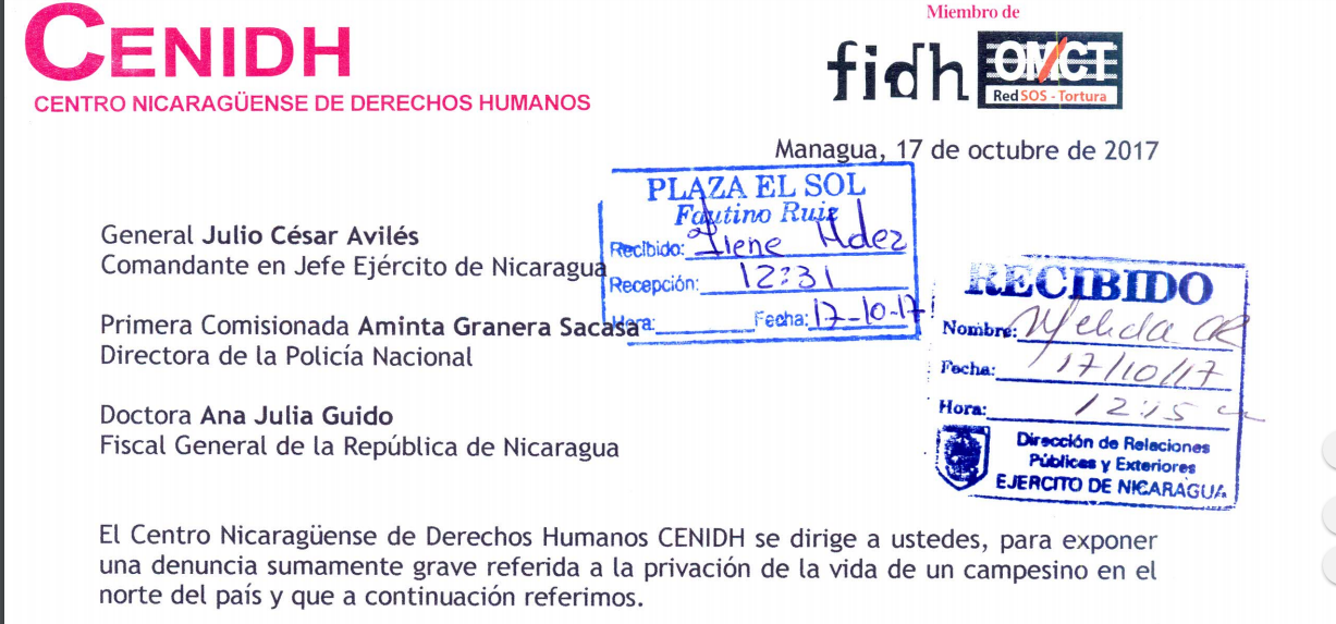 El Centro Nicaragüense de Derechos Humanos (Cenidh) envió carta al Jefe del Ejército de Nicaragua, a la Directora de la Policía Nacional y la Fiscal General de la República, exponiendo la grave denuncia de muerte violenta del señor Marco Antonio García Joya, de 30 años edad. García Joya, campesino de la comunidad Avión Quemado en el departamento de Jinotega, en el Norte del país, murió a manos de un grupo de oficiales del Ejército Nacional, el 29 junio recién pasado, se lee en la denuncia.