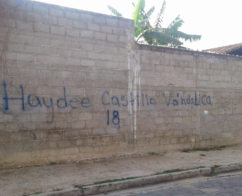 Esta mañana, Haydée denunció que amanecieron letrero en su casa con un #13. Y en varias paredes del pueblo de Ocotal pintas que dicen “Haydee vandálica”. “Seguro porque saben que vamos a arreciar con los tranques”, expresó.