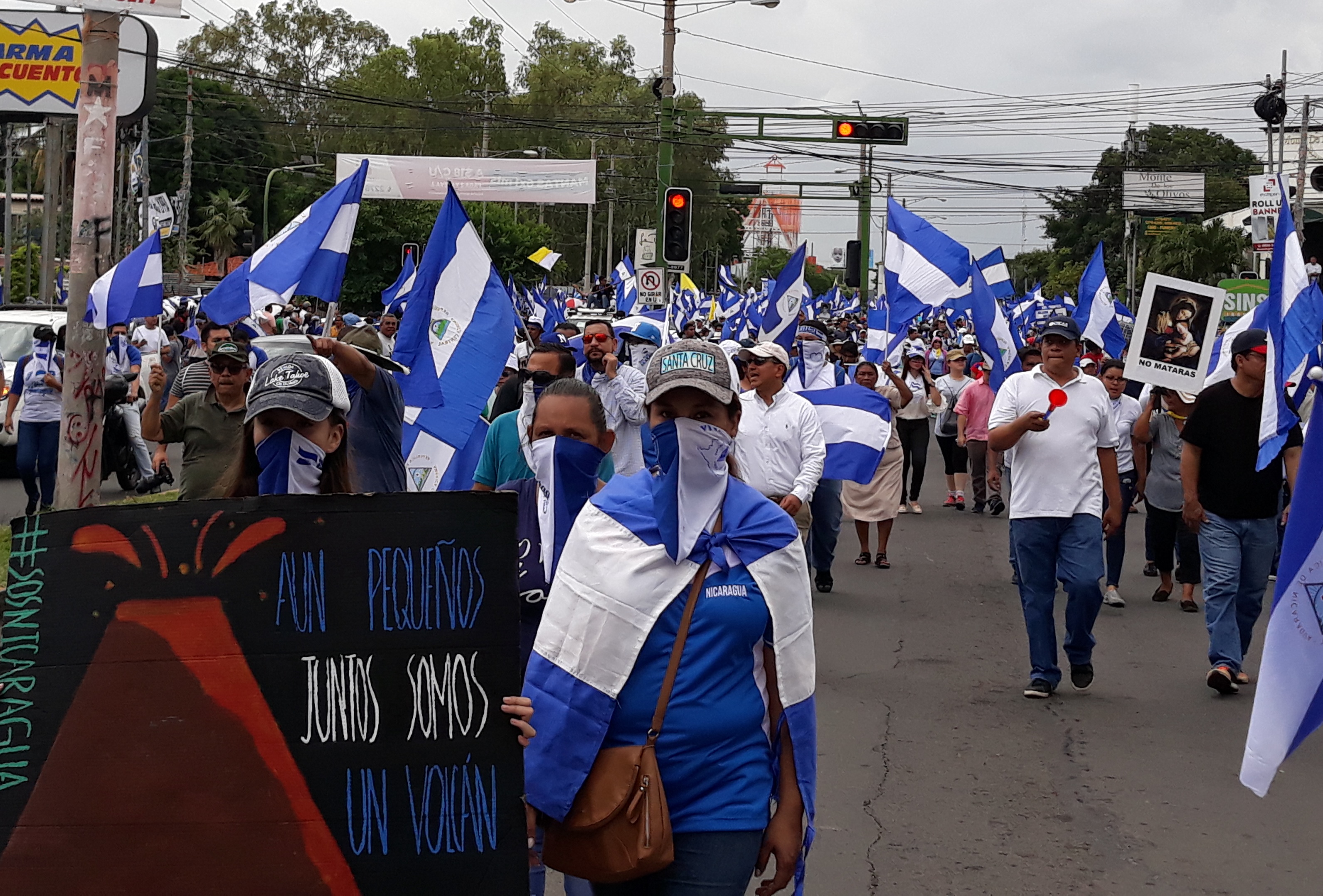 Miles caminaron bajo el sol y la lluvia. Y miles salieron de sus casas con banderas azul y blanco para saludar la marcha o unirse a la misma. En ambos casos, la lluvia no apagó el fuego del ánimo ciudadano durante la marcha. Y como un volcán en erupción, nunca pararon de exigir justicia, democracia, el fin de la represión y la salida de Daniel Ortega y Rosario Murillo.