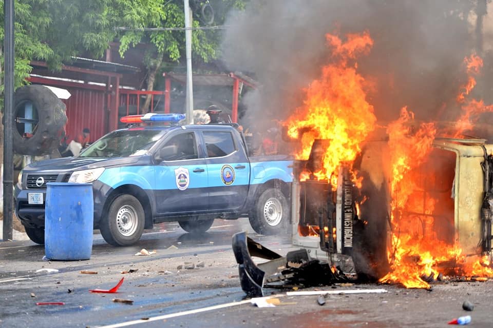 En una nota de prensa, la Policía Nacional, en un lenguaje a tono con la campaña de Daniel Ortega y Rosario Murillo, informó que aproximadamente a las 11:50 de la mañana, frente a las oficinas de Movistar en el kilómetro 6.5 carretera a Masaya, encapuchados con armas de fuego, lanza morteros y bombas Molotov, asaltaron una patrulla policial y agredieron al policía Melvin Antonio Romero, de 30 años. El subinspector Harling José Echaverry Salazar, de 42 años, resultó con trauma craneal, región occipital y heridas en el tórax, ocasionada por arma blanca, posteriormente incendiaron la patrulla.