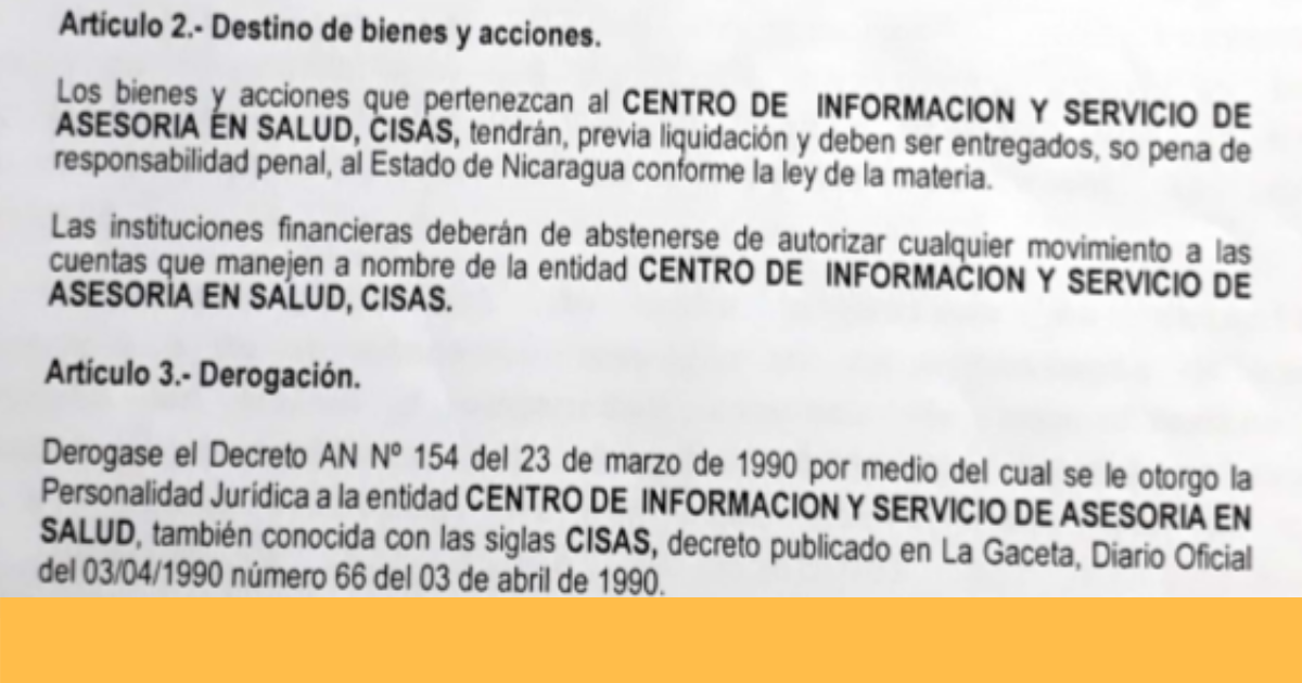 Los bienes de CISAS deberán ser entregados, so pena de responsabilidad penal, al Estado de Nicaragua, en un plazo de 10 días. Agrega que las instituciones financieras deberán abstenerse de autorizar cualquier movimiento de las cuentas que manejen a nombre de la entidad.