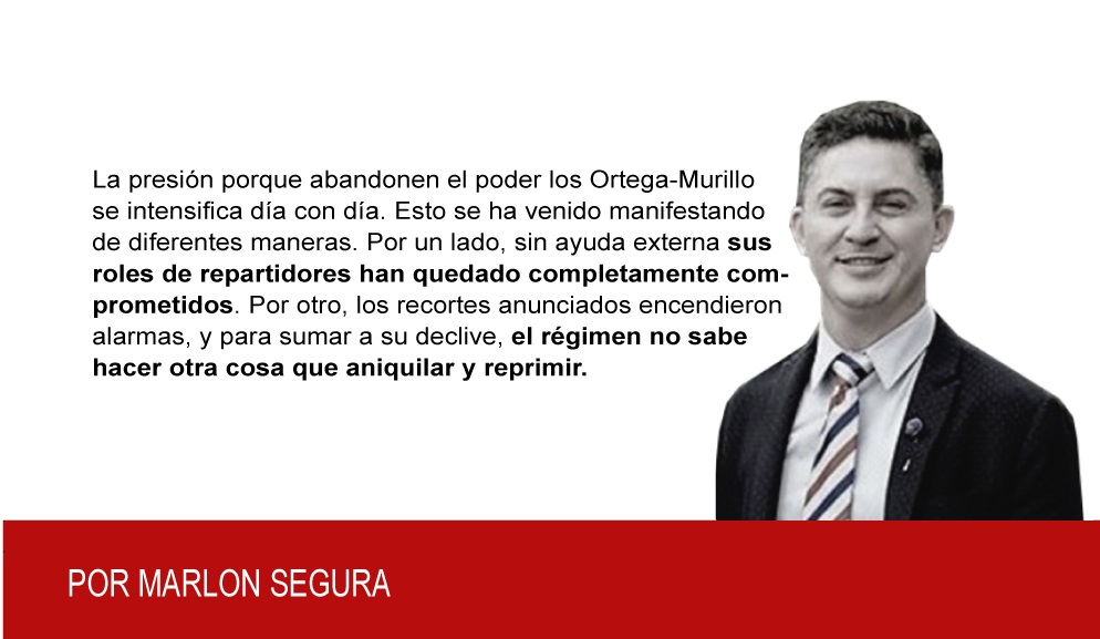 La presión porque abandonen el poder los Ortega-Murillo se intensifica día con día. Esto se ha venido manifestando de diferentes maneras. Por un lado, sin ayuda externa sus roles de repartidores han quedado completamente comprometidos. Por otro, los recortes anunciados encendieron alarmas, y para sumar a su declive, el régimen no sabe hacer otra cosa que aniquilar y reprimir.